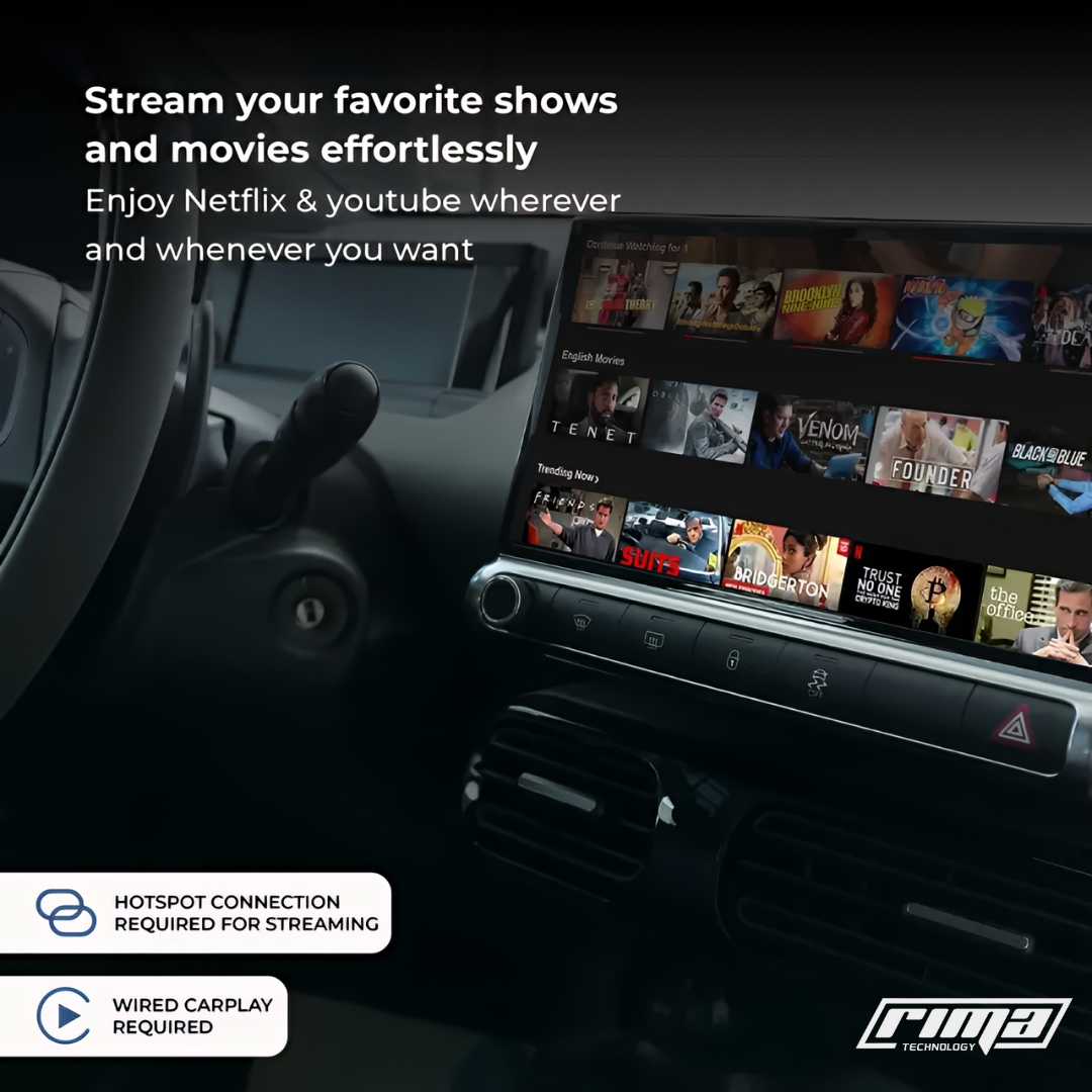 The Rima DriveFusion™ combines Wi-Fi and Bluetooth connectivity with advanced compatibility for both iPhone and Android devices. It transforms standard wired Apple CarPlay into a wireless experience — while adding expandable storage and access to YouTube, Netflix, and more.
