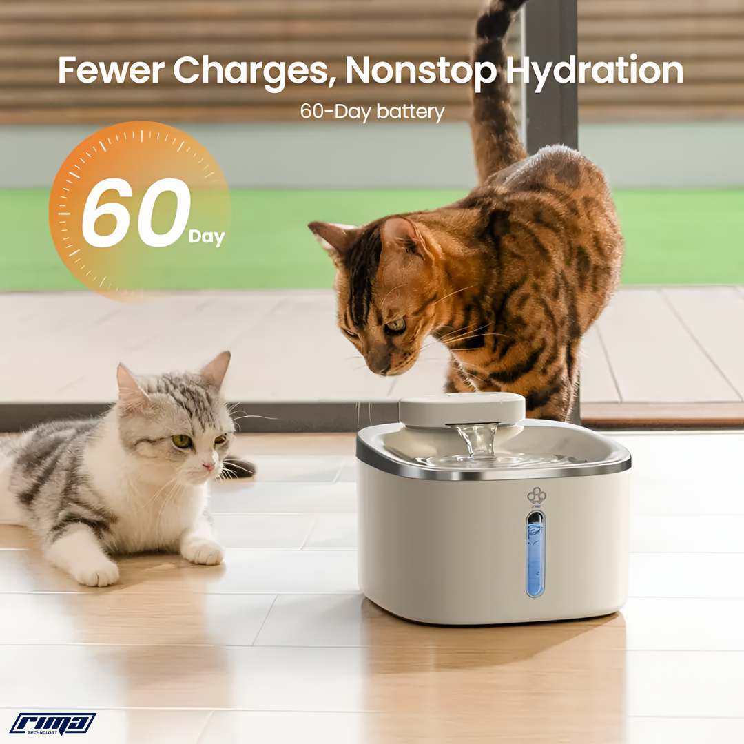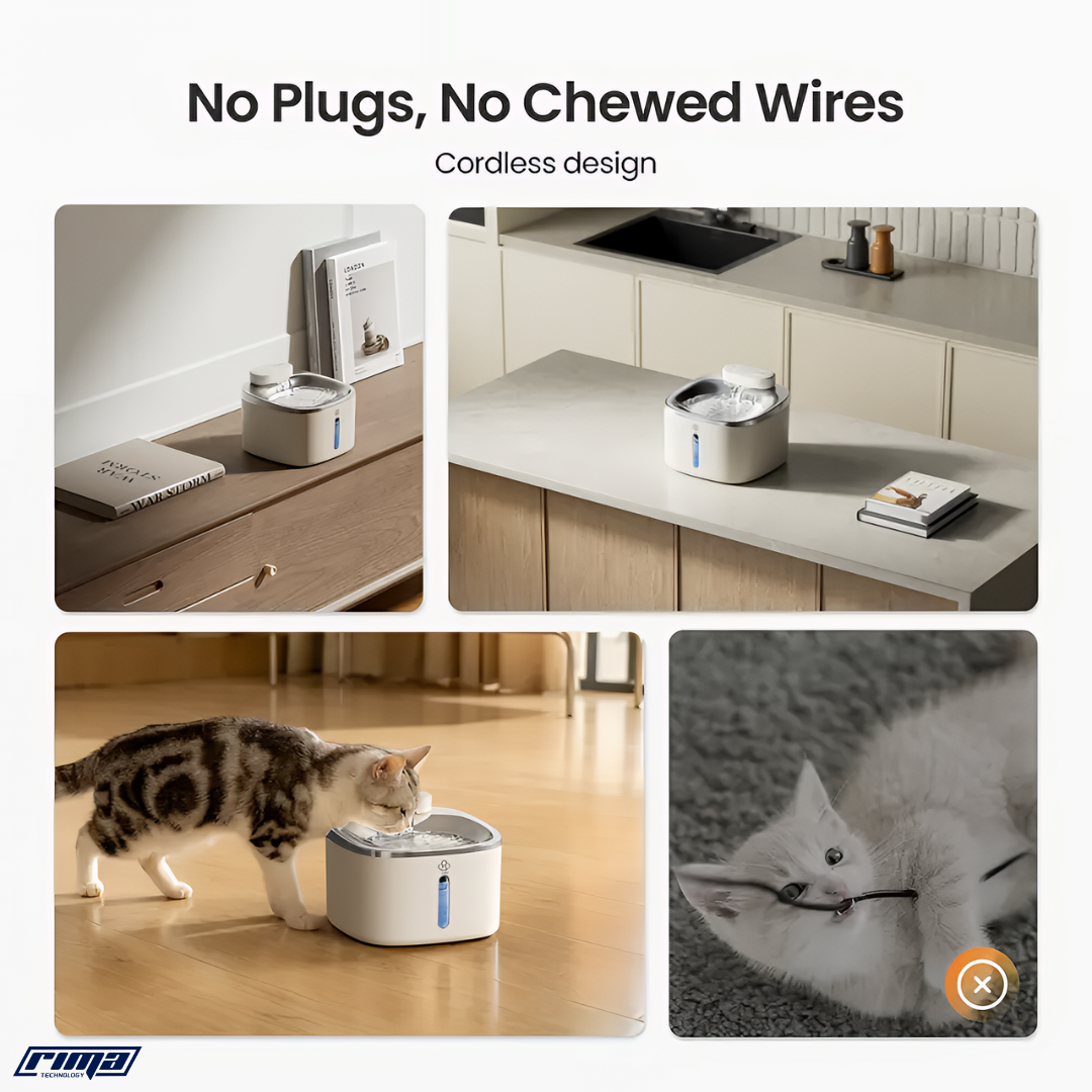 Rima Fontis is a total game-changer! No cords, no mess, just fresh water all day. I charge it once every few days and it runs smoothly. My two cats love it, and I feel better knowing they always have clean water. The setup took less than five minutes — couldn’t be happier!
