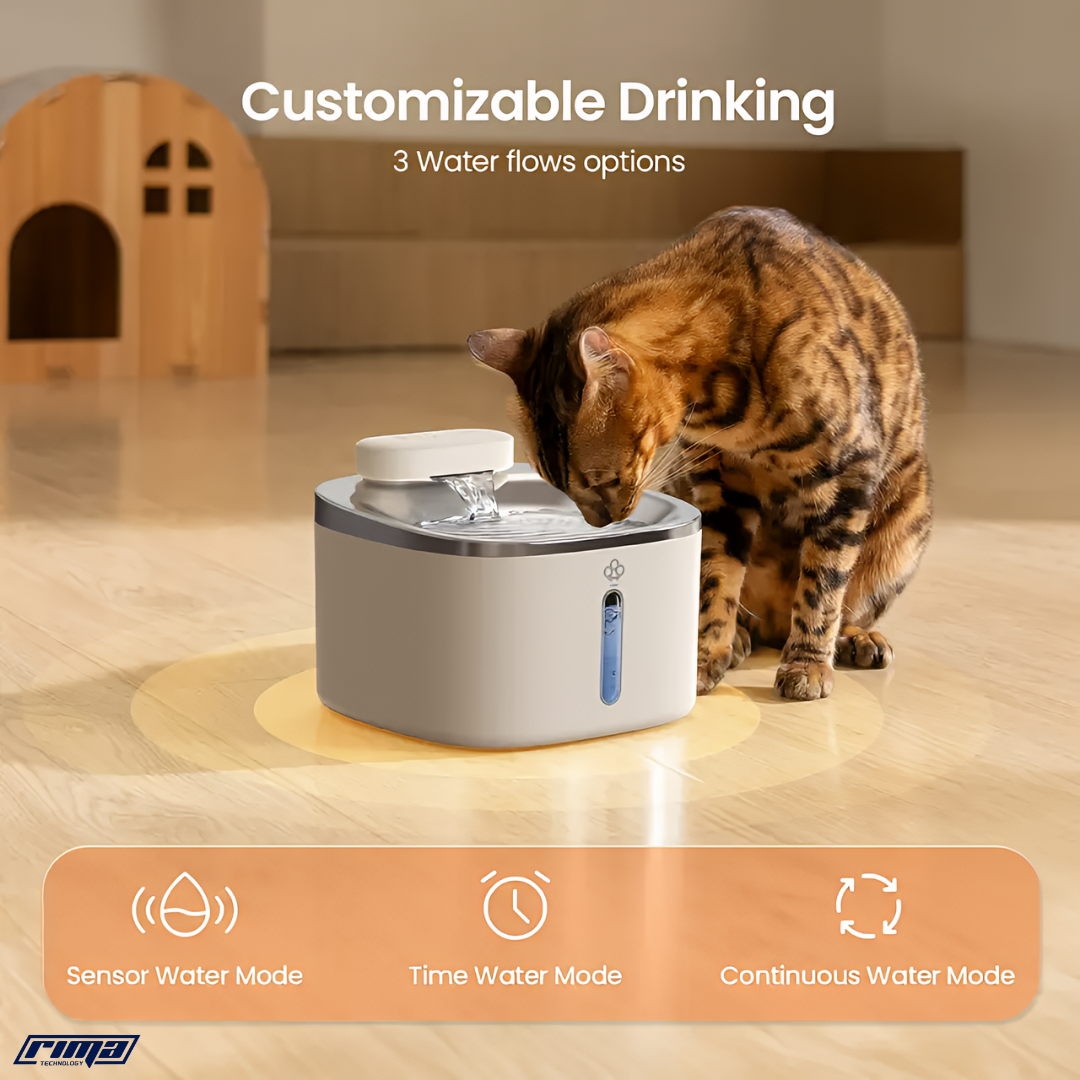 Equipped with a motion sensor, Rima Fontis dispenses fresh water only when your pet approaches. This not only saves energy but also encourages your cat to drink more frequently, promoting better kidney health and overall hydration.