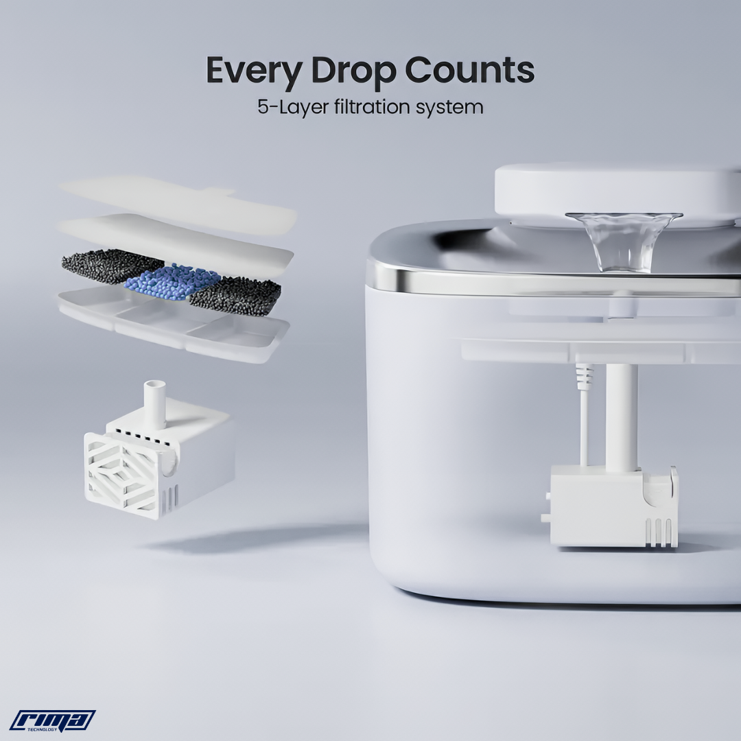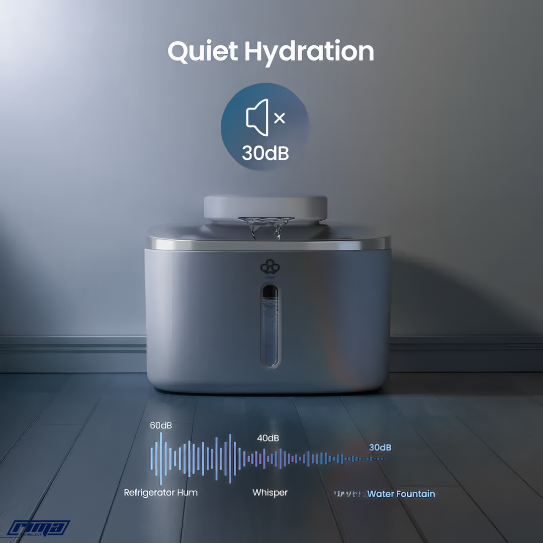 Designed with low-noise technology, Rima Fontis operates almost silently — perfect for light sleepers or quiet spaces. Your cat can drink comfortably without being startled, and you can enjoy peace of mind day and night.