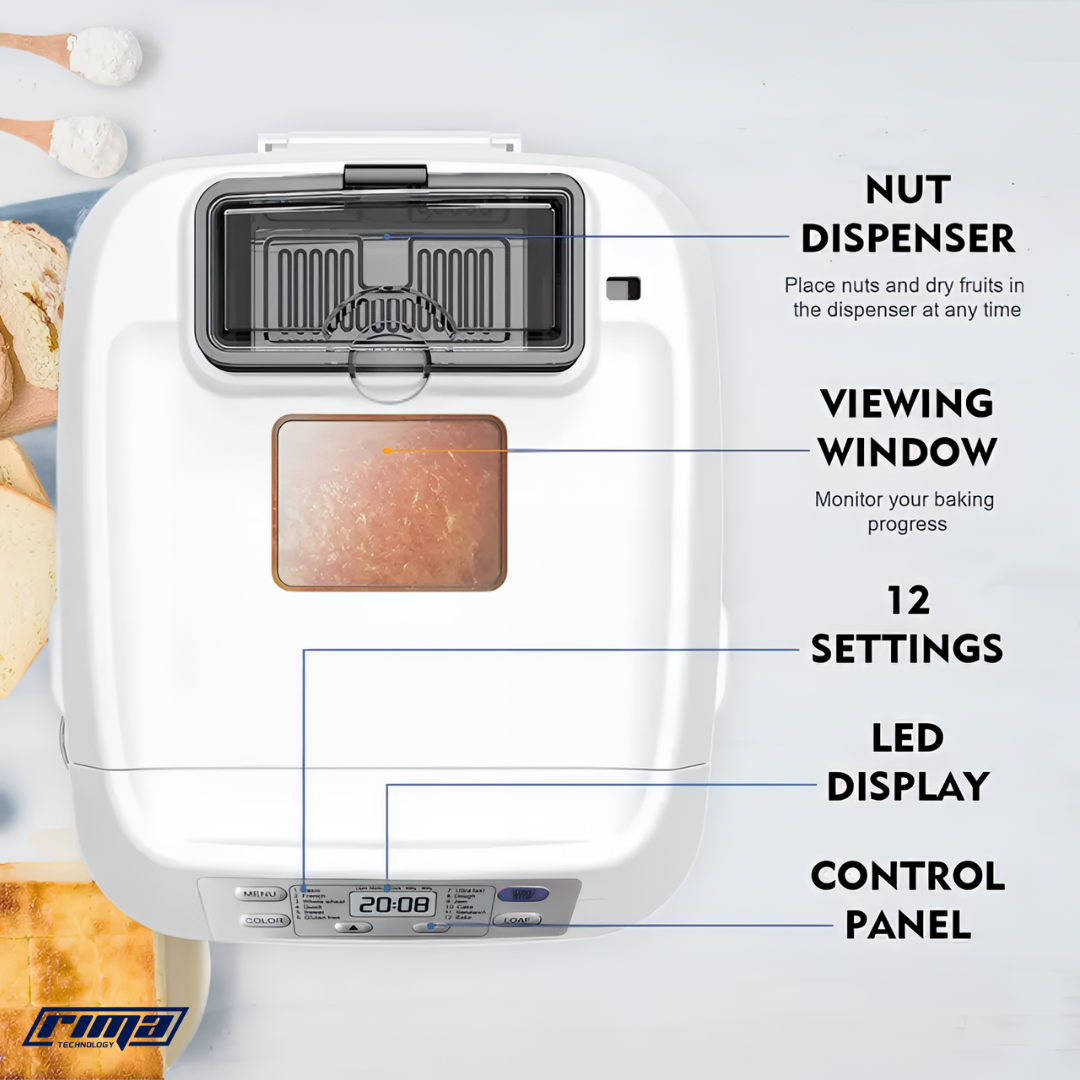 The Rima HomeBaker™ combines advanced baking technology with versatile functionality — featuring a 12-in-1 menu, automatic fruit and nut dispenser, and three crust color options. It’s designed to bring bakery-quality bread right to your kitchen.