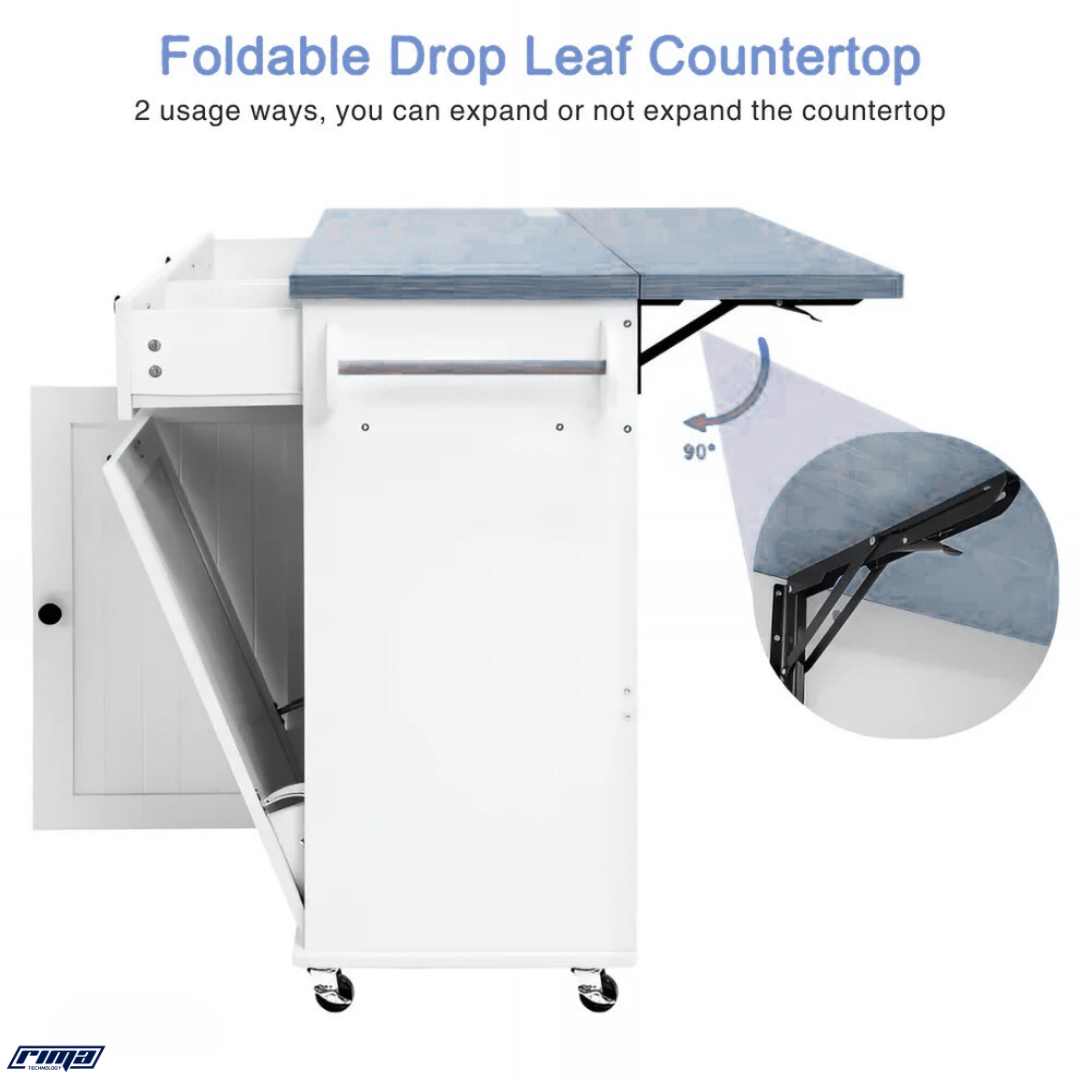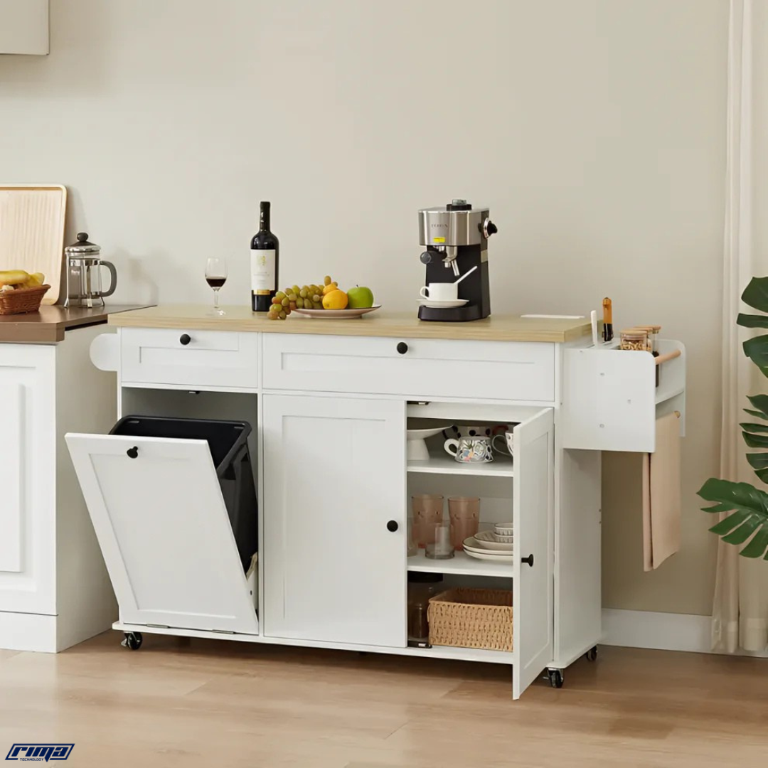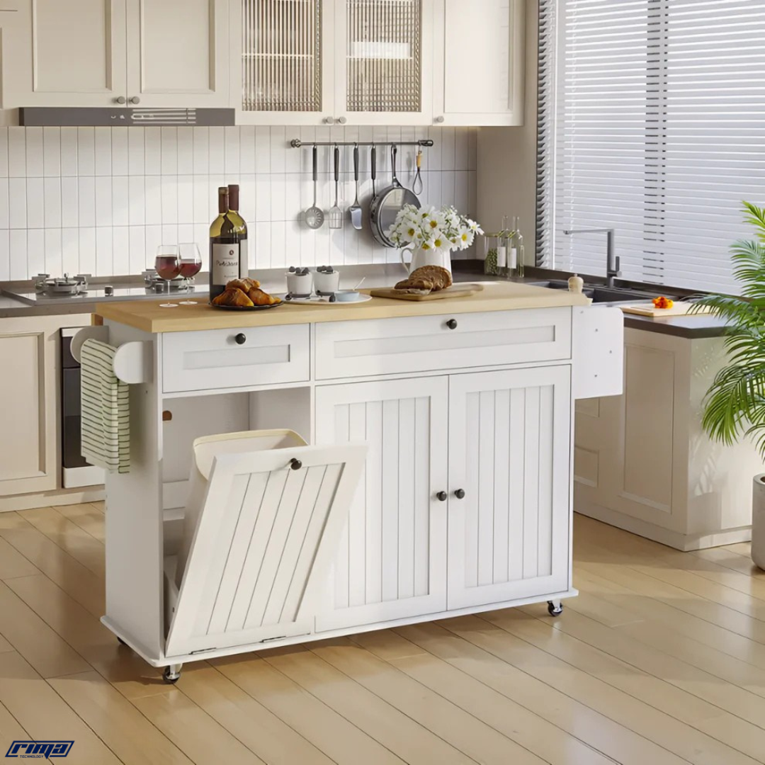 The Rima Nexus™ combines modern craftsmanship with intelligent design — featuring a power outlet for appliances, a drop-leaf for extended workspace, integrated spice and knife racks, and a hidden trash cabinet. It’s the ultimate all-in-one kitchen solution.