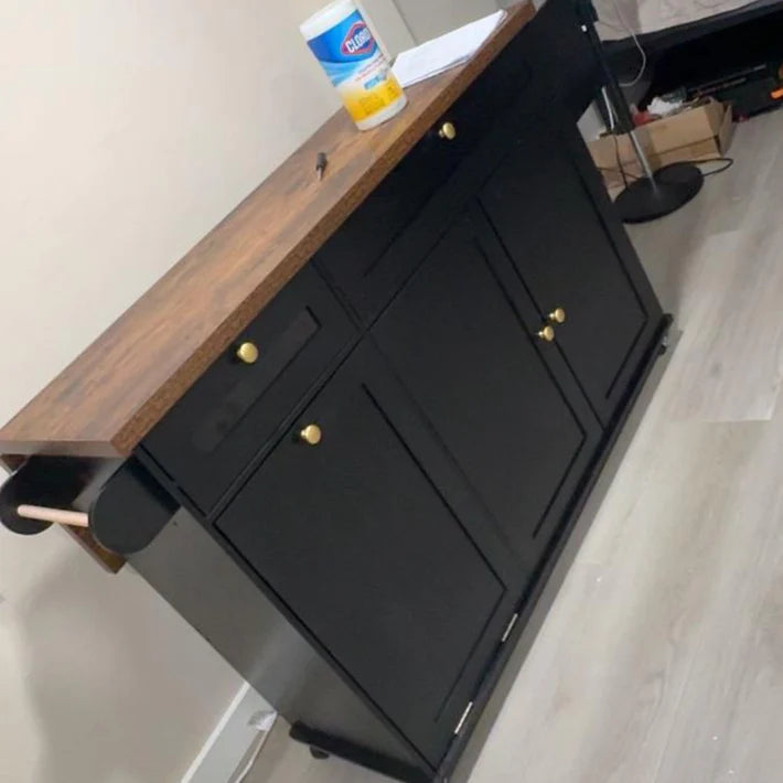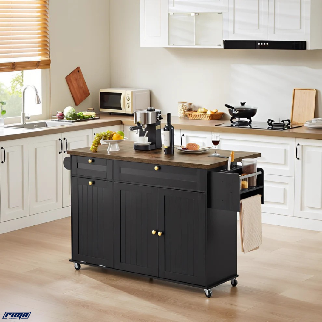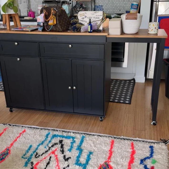 I’m in love with my Rima Nexus! The extended drop-leaf is perfect when I need extra space for dining prep or serving food when friends come over. The build quality is solid, the drawers are smooth, and the black finish with the wood top looks so sleek in my kitchen. I can easily roll it around when rearranging the space, and it locks securely in place when I’m using it. It’s both practical and beautiful — exactly what my home needed!