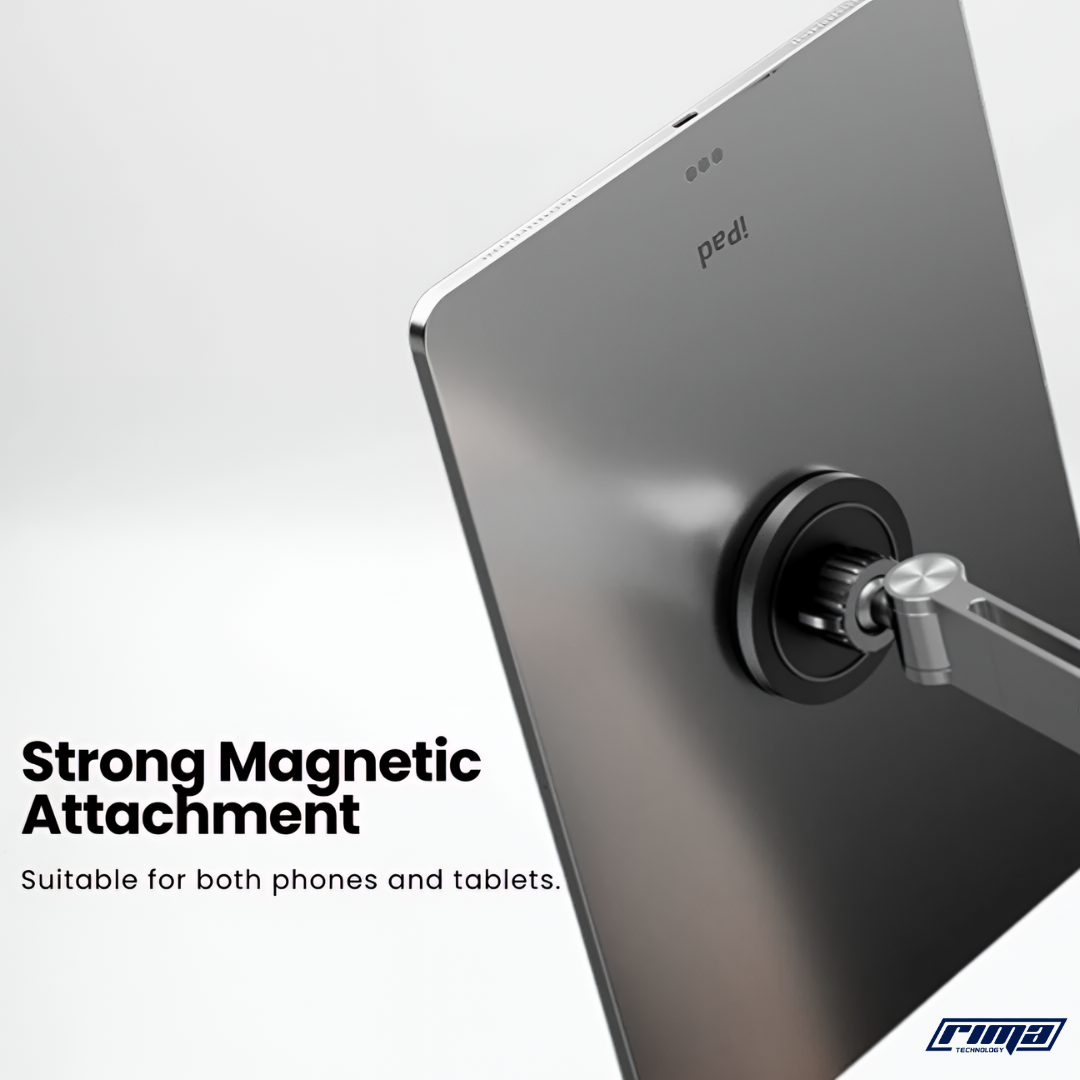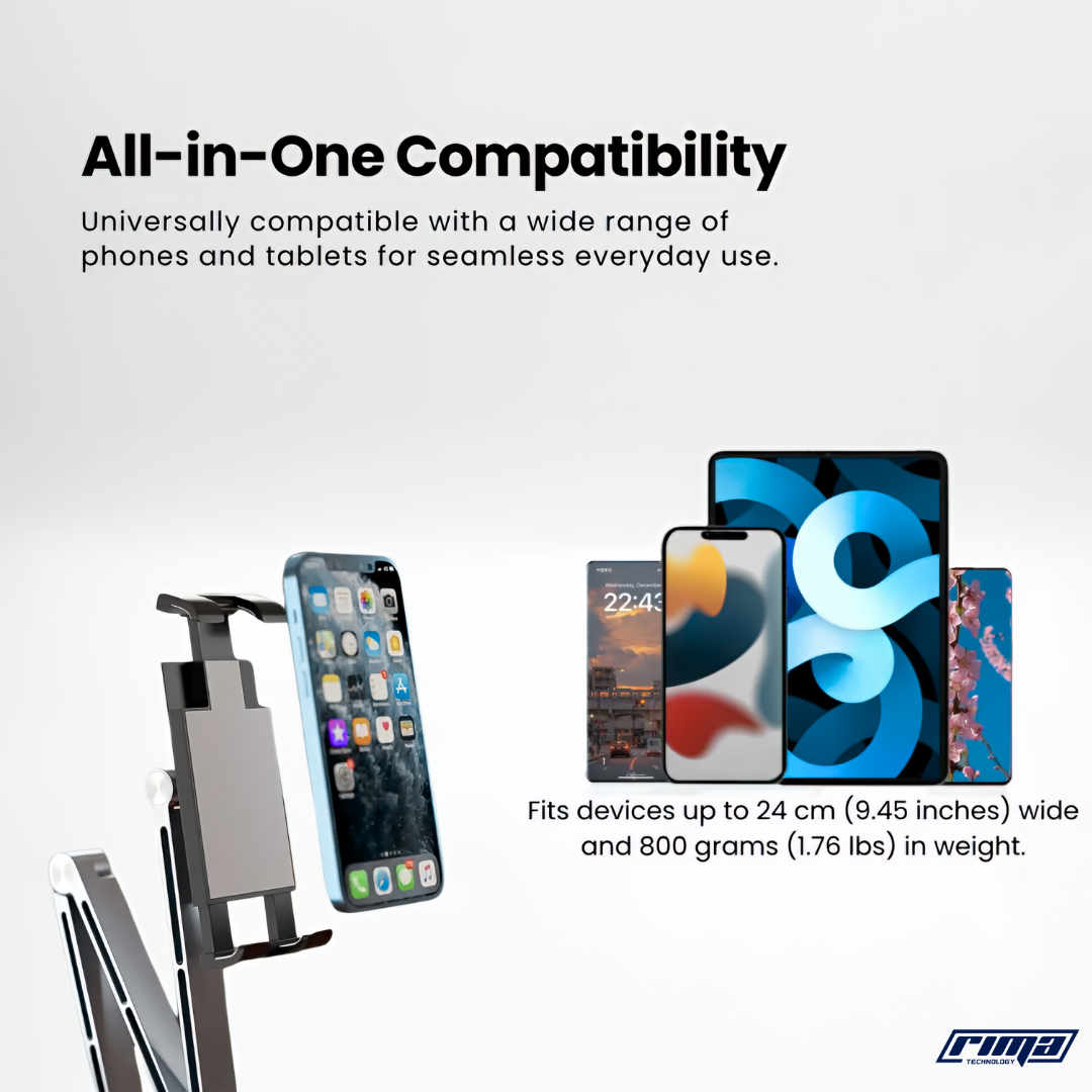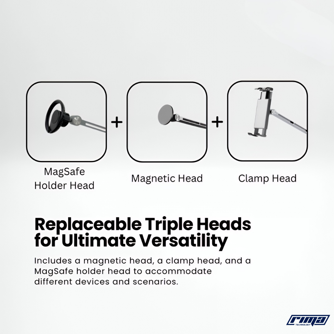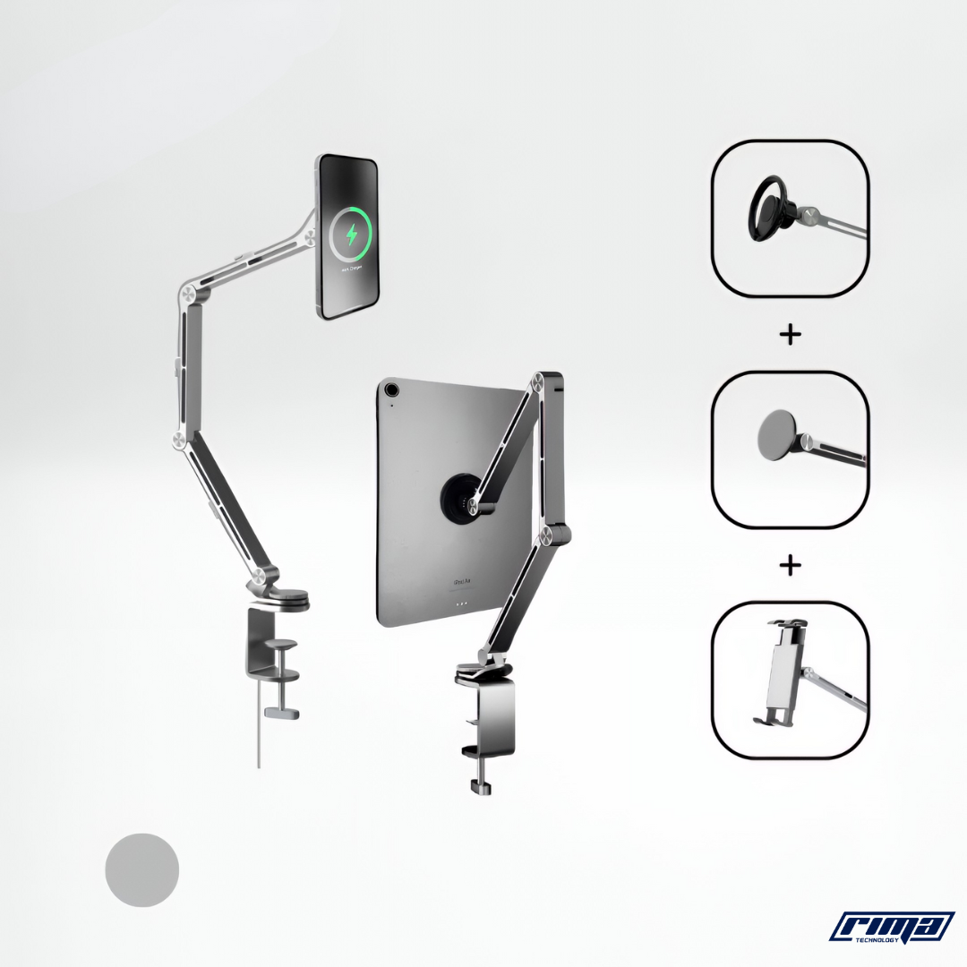 The Rima ProArm™ supports a wide range of devices — from smartphones and tablets to cameras and accessories. Its adjustable mount and interchangeable heads make it ideal for creators, professionals, and multitaskers who switch between devices with ease.