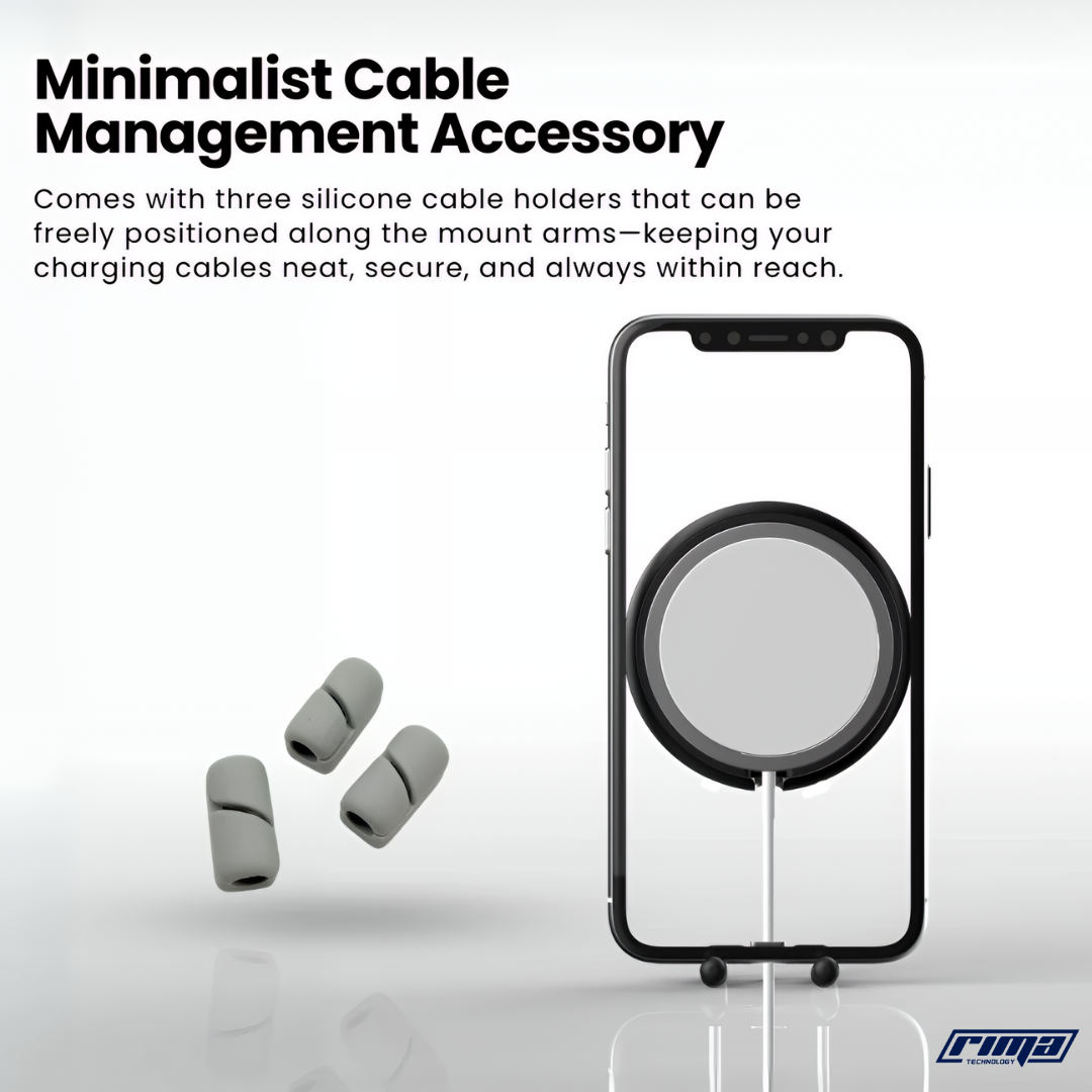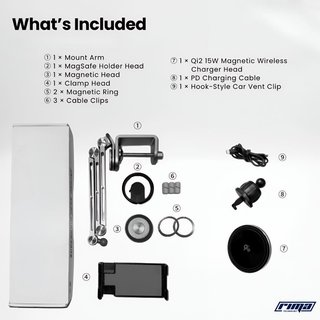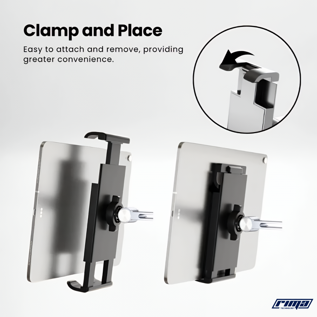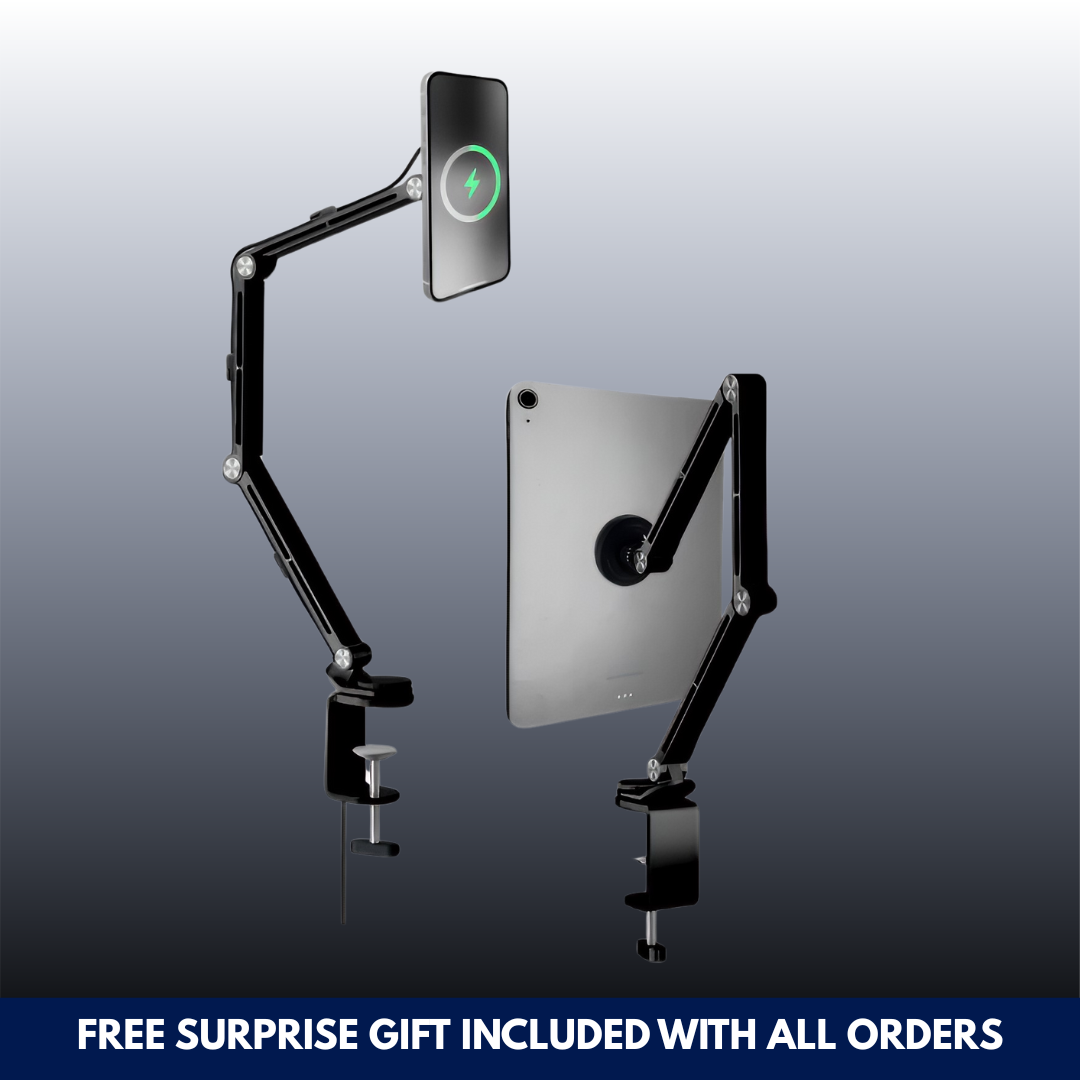 The Rima ProArm™ supports a wide range of devices — from smartphones and tablets to cameras and accessories. Its adjustable mount and interchangeable heads make it ideal for creators, professionals, and multitaskers who switch between devices with ease.