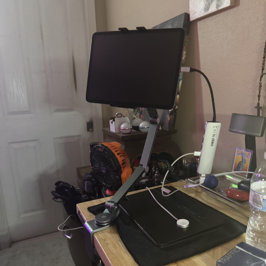 The Rima ProArm fits perfectly on my small desk and keeps my iPad at the ideal height for drawing and editing. The arm moves smoothly, locks firmly, and looks sleek in my setup. I love how sturdy it feels even with heavy devices. Charging cables fit neatly, and it helps me stay comfortable for hours. It’s honestly one of those products that makes you wonder how you ever worked without it.