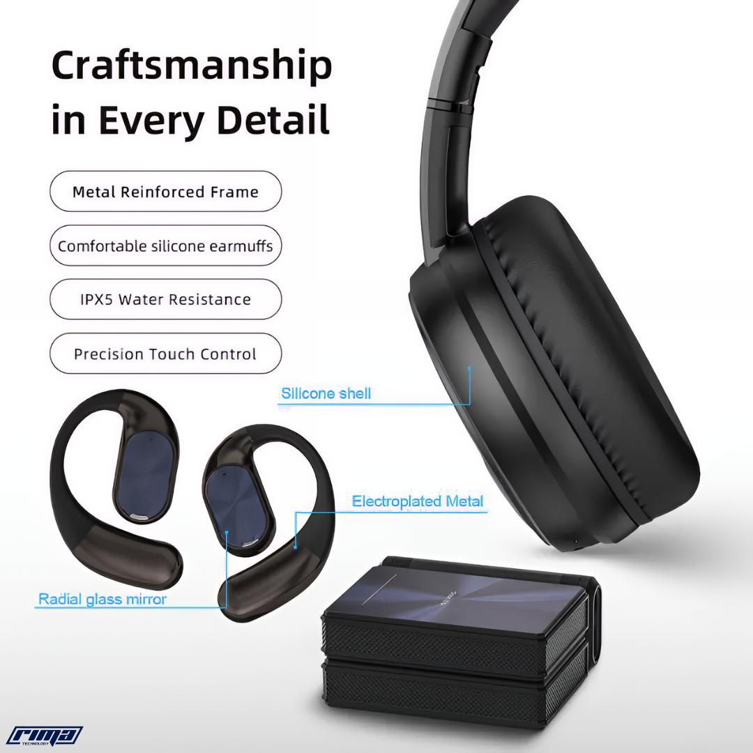 The Rima SoundCore™ combines deep bass, crystal-clear sound, and a noise-cancelling mic in a dual Bluetooth setup — offering over-ear comfort and compact portability in one set.